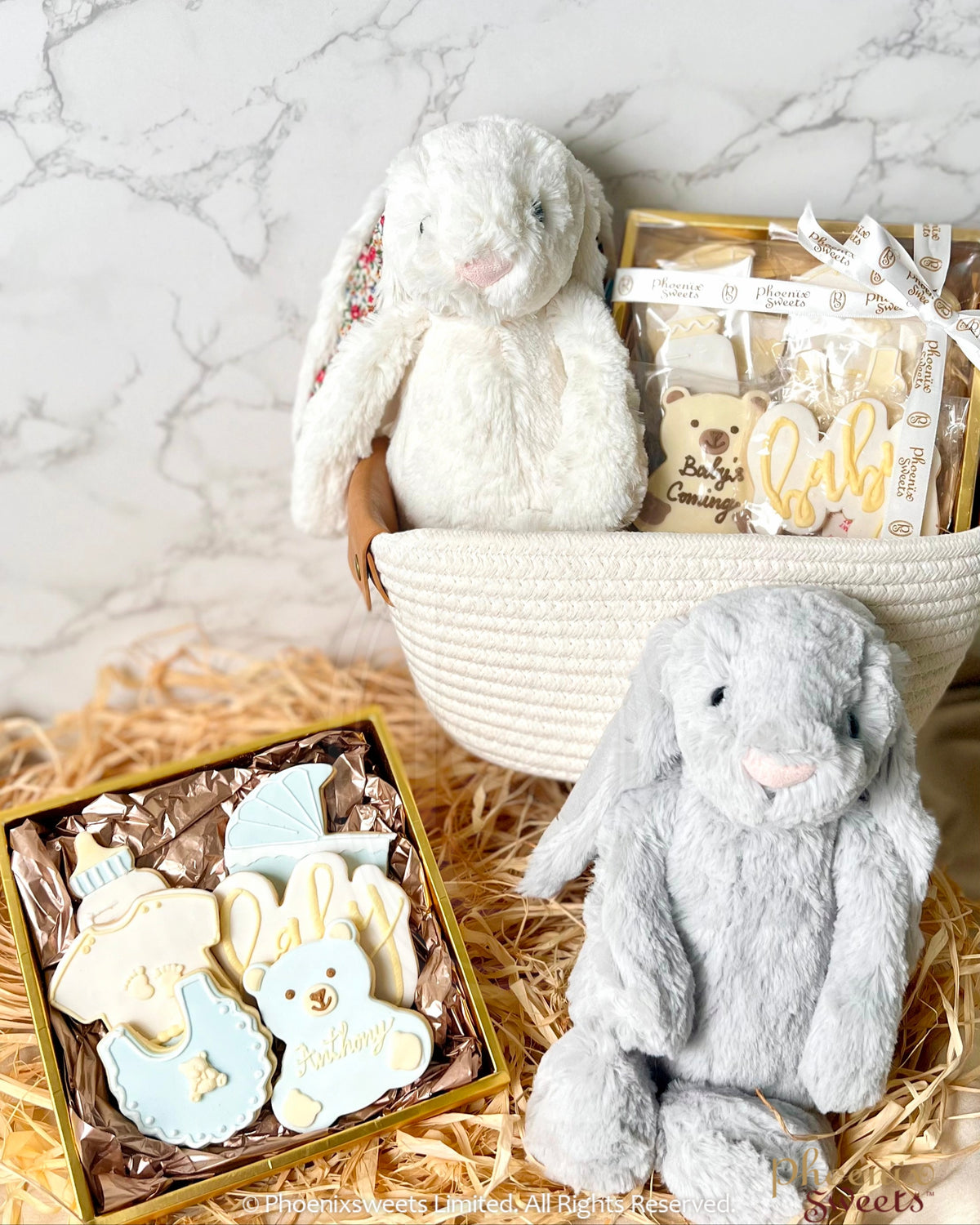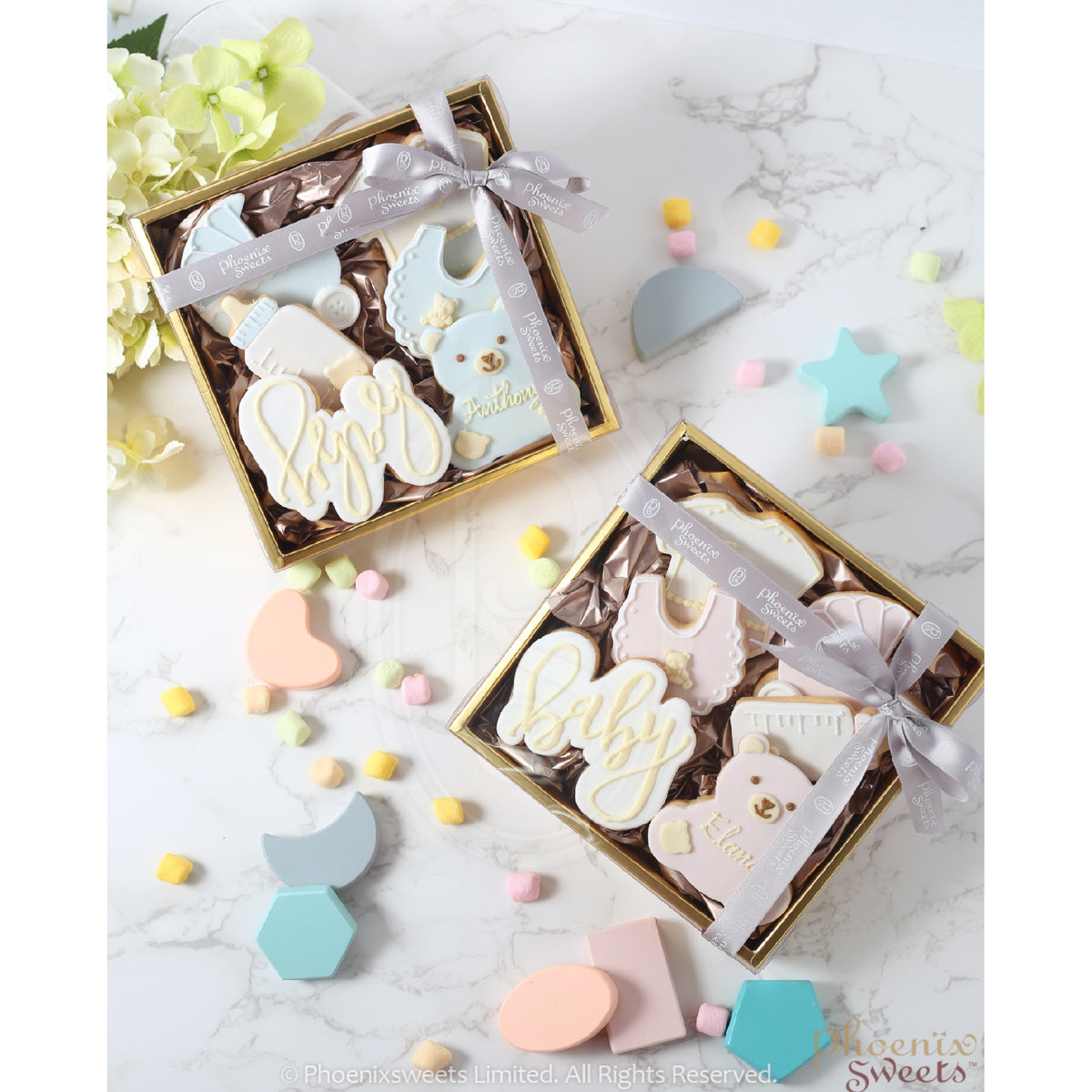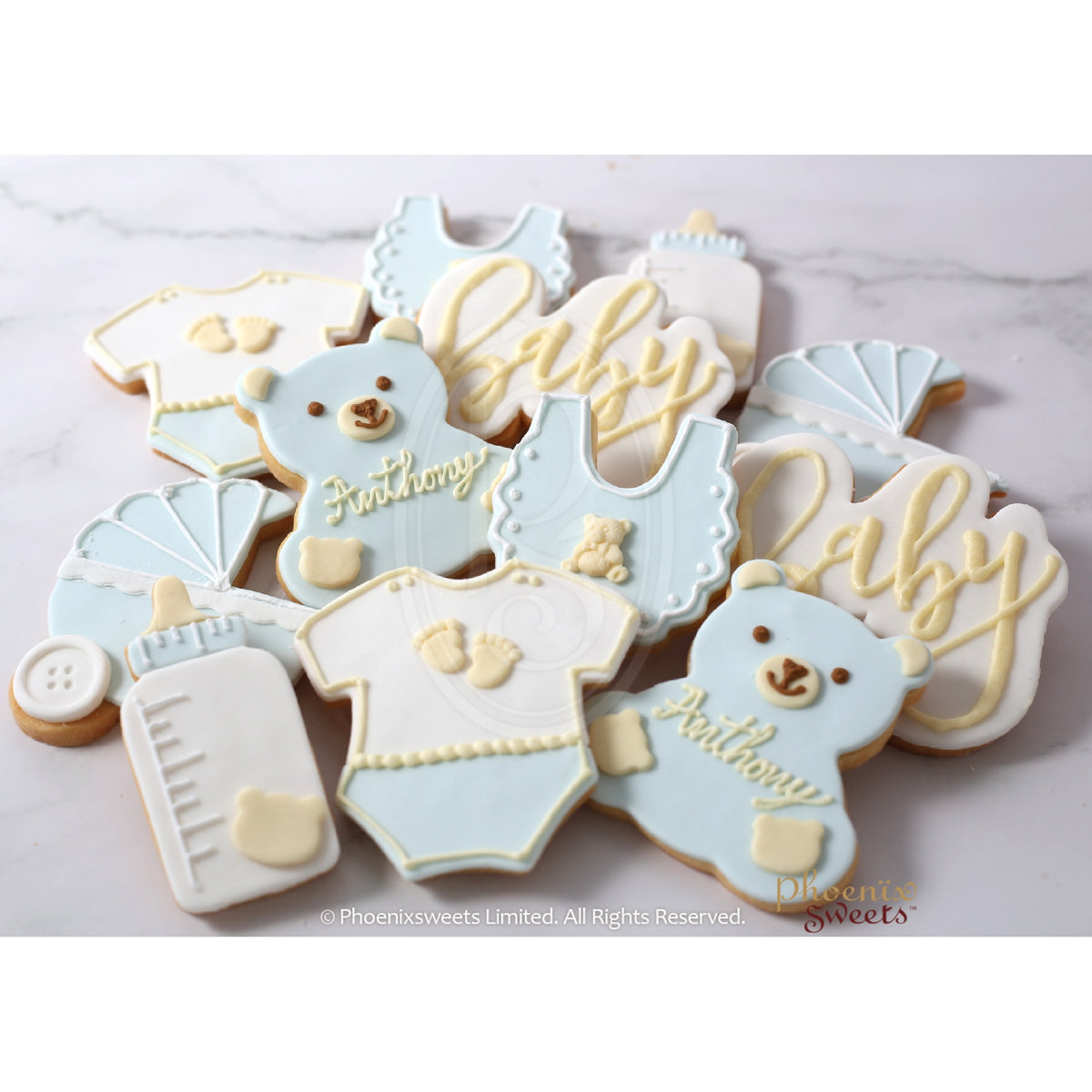 You can choose baby blue or pink, we can put the baby's English name on the bear cookies.