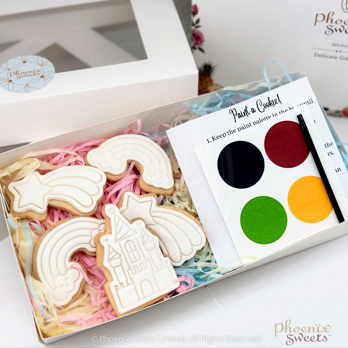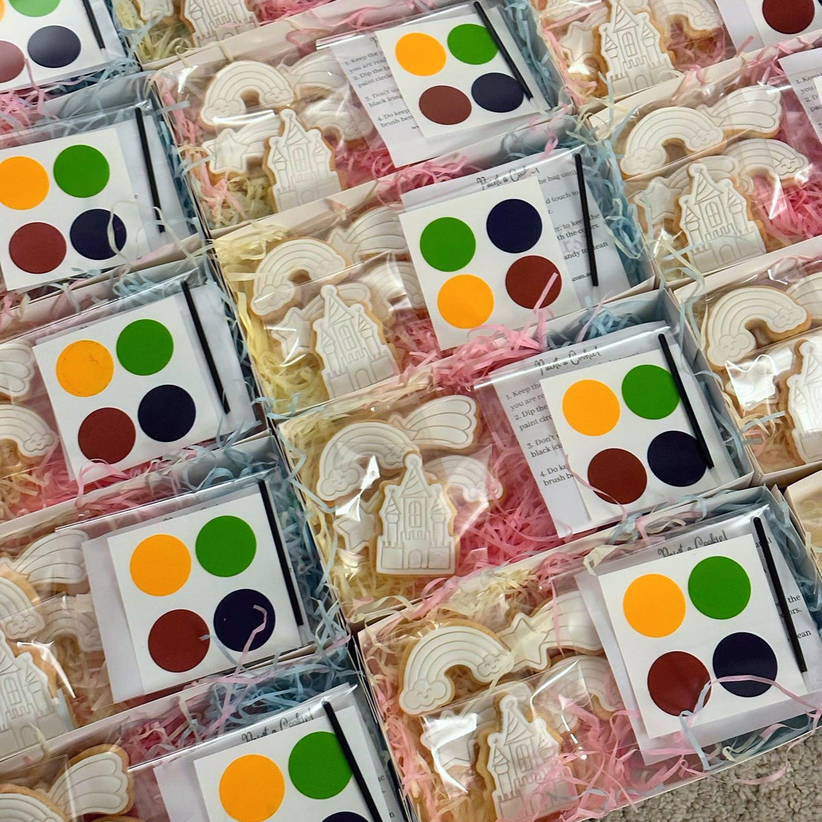 可愛的曲奇套裝配上可食用顏料,讓你可以像畫水彩畫一樣裝飾曲奇。禮盒內每塊曲奇是獨立小膠袋包裝。