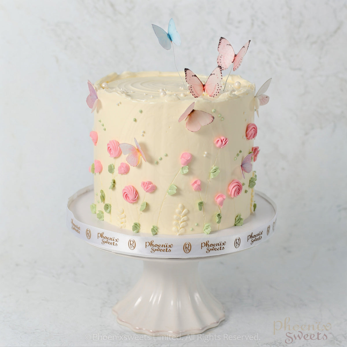 Make any occasion extra special with the elegant and heart-warming cake from Phoenix Sweets. This showstopper cake is a decadent treat for the senses, featuring the handcrafted cream piping flowers decoration with butterfly decorations.